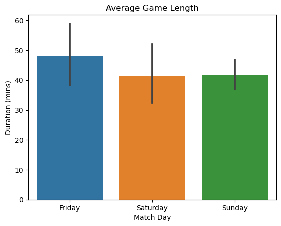 Two additional curiosities here, that I couldn’t necessarily tie to the “worth” or “cost” factor. Given that there’s been 9 games on Friday, 10 on Saturday, and 5 on Sunday, that’s not enough data to determine if the average number of kills per game, or the average game duration each day is different (grey bars represent 95% confidence interval – and all overlap).