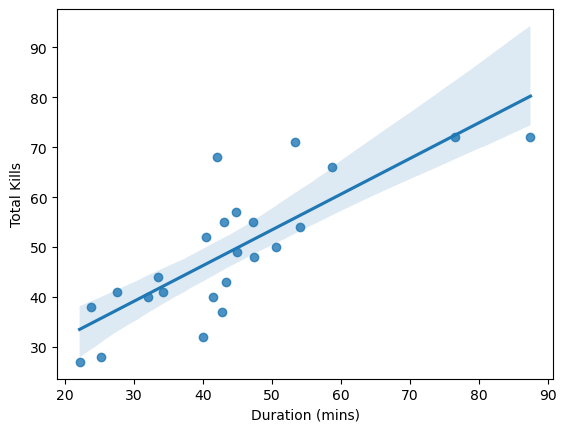 Looking at the R-squared value (and the graph on the side), it shows that a linear regression fit decently explains the variance in the data. There are some outliers, causing the confidence interval to be relatively large. Overall, roughly every minute and a half we can expect there to be an additional kill happening in game.