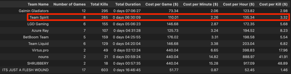 Team Spirit won and I was super happy with that outcome. Though looking at the cost (or vice-versa “worth”), Gaimin Gladiators fans should be quite happy. They had an incredible run and only lost in the end. What I also think is noteworthy here is that GG had such high kill ratio (very aggressive play style), that their cost per kill is almost the same as the cost per kill in the table below, with the shortest tournament.