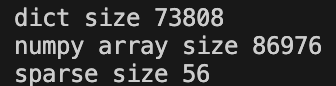 I have commented this out in the code, but feel free to try it. In my case, for Part 1, optimizing the grid as much as possible, here’s the differences (in bytes): Sparse matrix representation wins, and the dictionary is still smaller than the numpy array with the smallest possible dimensions to accomodate for Santa’s travels;