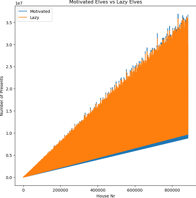 There’s definitelly more interesting stuff that can be done here, but for starters, it appears that both the max and mins are getting wider apart comparing the Motivated elves (infinitely delivering presents) vs the Lazy ones (stopping delivery at 50 houses – better watch out, or be replaced by Amazon soon!).