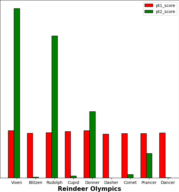 Also, Santa’s just hateful! Using the first socing system at least the competition was fierce, the second one? Not even close! (I’m not showing the actual points as the author of AOC requests not to share any of that info – but the higher the bar, the more points a reindeer got relative to others).