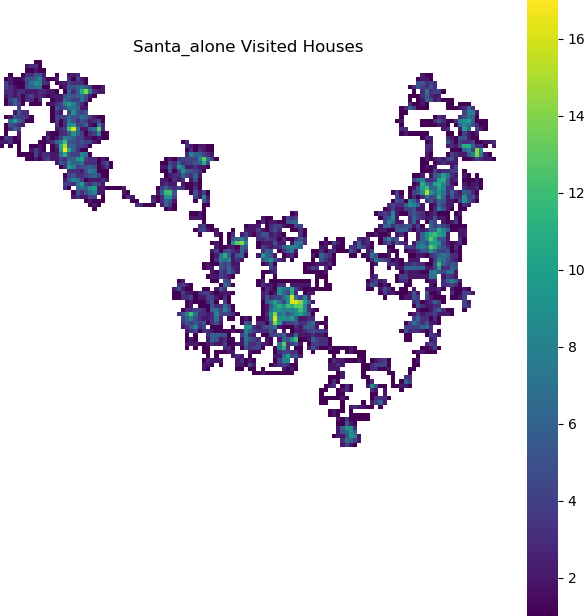 I’ve also plotted the density of Santa’s visits, just for fun – there’s going to be a whole bunch of unhappy people (all the white spaces) and a few incredibly happy ones (the yellow spaces, visited around 16 times)!