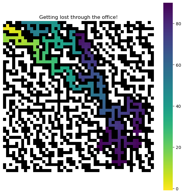 Well am I glad I took the time to truly understand day 11! With that knowledge, this one was pretty much a walk in the park office. I structured it in a much cleaner way as well, and had it ready for part 2! Plus, look at this awesome showcase of me getting lost in the office (legend = # of steps). Black indicates walls and white are offices. Stanley, is this your office???